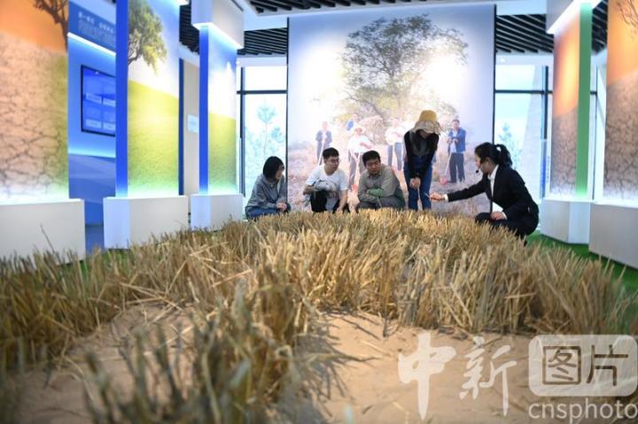 4月16日,甘肅省武威市古浪縣,學生們在八步沙兩山實踐創(chuàng)新基地參觀了解當?shù)靥禺a(chǎn)。