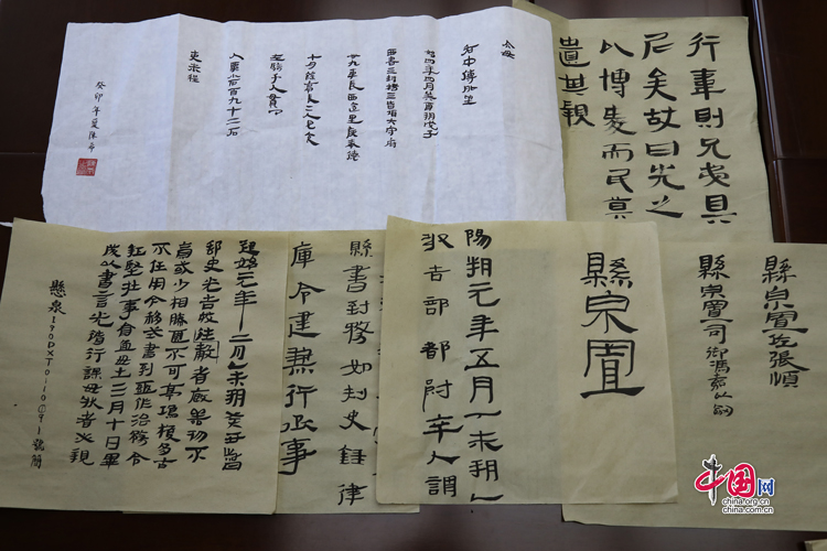 7月31日,蘭州大學(xué)古文字學(xué)強(qiáng)基計劃同學(xué)展示臨摹簡牘的書法作品。中國網(wǎng)記者 鄭偉 攝