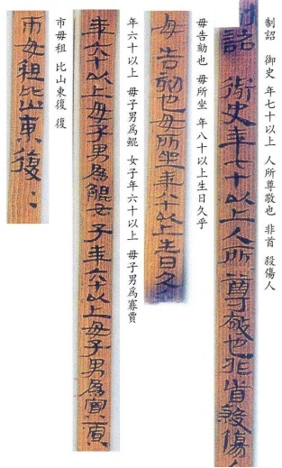 1981年出土于武威磨嘴子漢墓中的“王杖詔書令冊”簡則是關(guān)于古代敬老養(yǎng)老制度的法律法規(guī),堪稱古代“老年人權(quán)益保護法”。原簡背面有編號第一至第廿七,共27簡,但第15簡已缺失,余26簡首尾俱全。正面有556個字,雖歷經(jīng)千年,上面墨書的漢隸依然清晰可見。簡文內(nèi)容豐富,記載明確,既有撫恤鰥寡孤獨廢疾之人的具體做法,又有敬老養(yǎng)老高年賜王杖的明確規(guī)定。