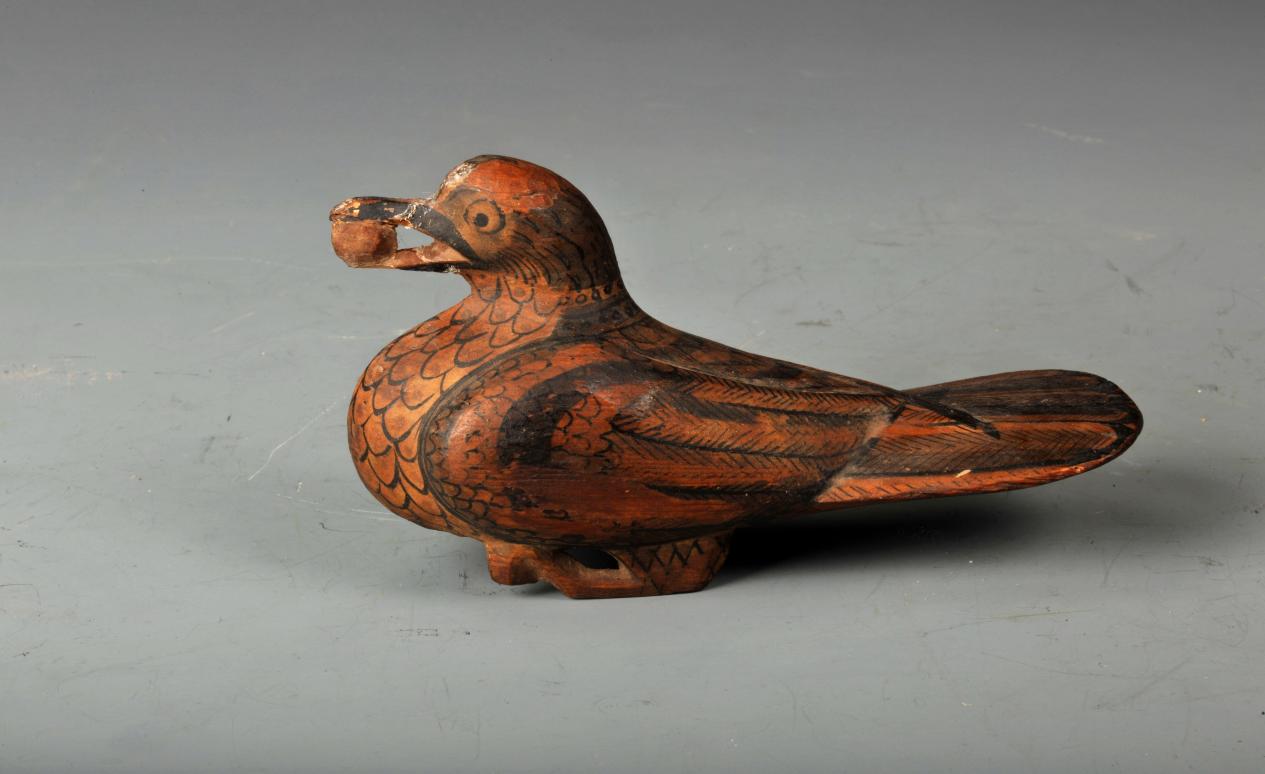 木鳩是王杖的杖首。在武威市博物館里,就有一件國寶級文物漢代彩繪漆木鳩:一只臥姿木質(zhì)鳩鳥,雙目平視,口中含物,兩翼收攏于背部,尾呈平行片狀,兩足曲伸,中有方形卯,為杖桿接榫處。通體墨彩繪制,從頸至腹繪魚鱗狀羽毛,兩翼及尾上部繪魚骨狀羽毛?!逗鬂h書·禮儀志》中記載:“王杖長九尺,端以鳩鳥為飾。鳩者,不噎之鳥也。欲老人不噎。”,“鳩”同于漢字“九”,有九九長壽的寓意;鳩鳥被稱為不噎之鳥,表達了對老人吃飯不噎、身體康健的美好祝愿。