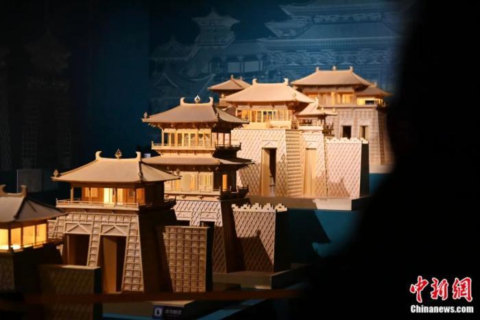 《千年營造——敦煌壁畫中的建筑之美》特展上的古代建筑模型。該模型的“單門道花磚城門”來源于莫高窟第159窟。李亞龍 攝