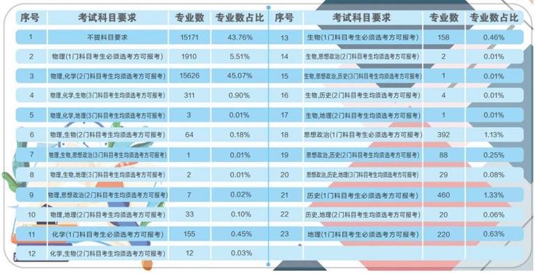 據(jù)了解,根據(jù)《甘肅省深化高等學(xué)校考試招生綜合改革實(shí)施方案》要求,從 2021年秋季入學(xué)的普通高中一年級(jí)學(xué)生開(kāi)始,實(shí)行基于統(tǒng)一高考和高中學(xué)業(yè)水平考試成績(jī)、參考綜合素質(zhì)評(píng)價(jià)的高校考試招生模式。到2024年,基本形成分類(lèi)考試、綜合評(píng)價(jià)、多元錄取的高??荚囌猩贫?,健全促進(jìn)公平、科學(xué)選才、監(jiān)督有力的高??荚囌猩w制機(jī)制。此次在我省報(bào)送選考科目要求的高校專(zhuān)業(yè)共計(jì)64092條,其中本科專(zhuān)業(yè)34670條。專(zhuān)業(yè)選考科目要求共有23種組合,其中不提科目要求的本科專(zhuān)業(yè)數(shù)量占本科專(zhuān)業(yè)總數(shù)的43.76%,含物理科目的占比為51.79%,含化學(xué)科目的占比為46.46%,含歷史科目的占比為1.74%,含“物理+化學(xué)”科目的占比為45.98%。