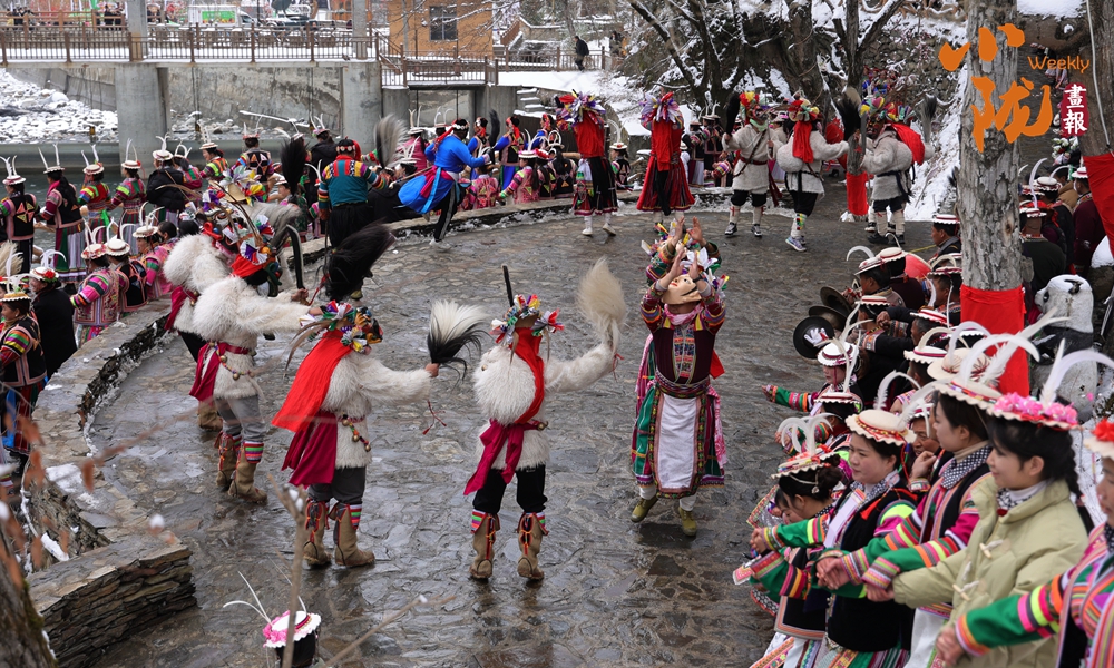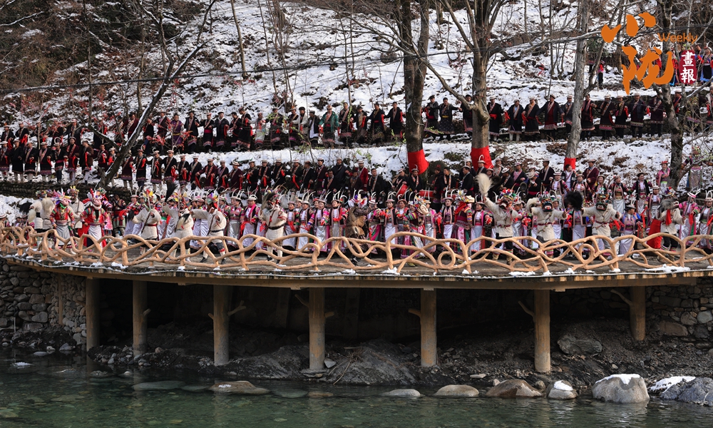 河畔的小路上和河岸的觀景臺上,白馬人身著特色服飾,錯落有致,載歌載舞,跳起了獨具魅力的“池哥晝”。