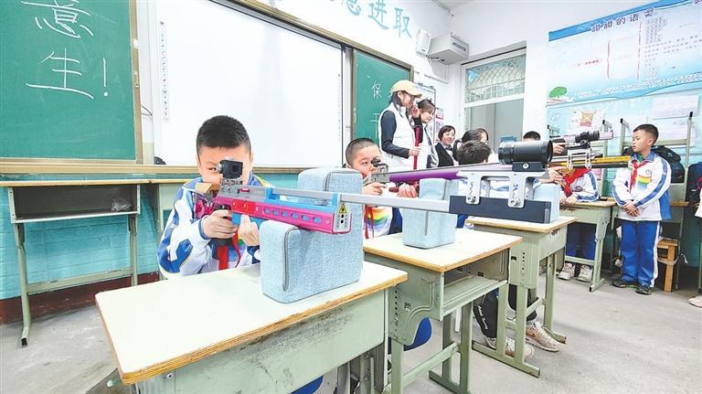 平心靜氣、心無旁騖、聚精會神……在光電射擊社團,孩子們屏氣凝神,舉槍、瞄準、擊發(fā),一氣呵成,同學們正在專業(yè)老師的指導下開展激光槍射擊訓練,他們手拿激光槍,集中注意力瞄準靶心,一次次果斷擊發(fā),架勢十足。