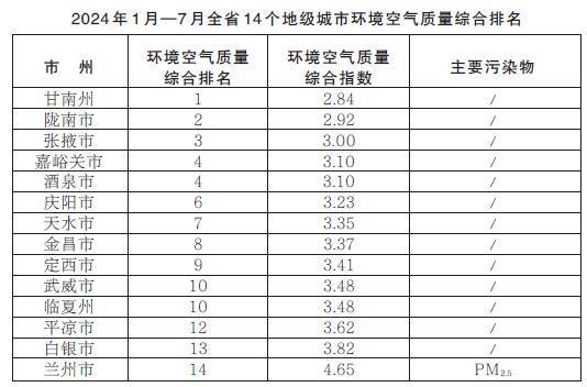 2024年1月—7月,全省14個地級城市環(huán)境空氣質(zhì)量綜合排名由高到低分別為:甘南州、隴南市、張掖市、嘉峪關(guān)市、酒泉市、慶陽市、天水市、金昌市、定西市、武威市、臨夏州、平?jīng)鍪小足y市、蘭州市。