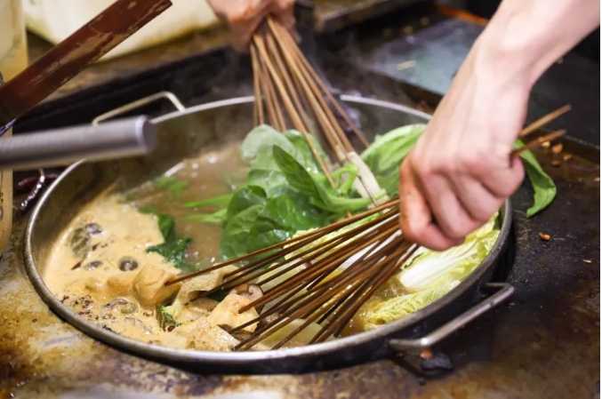 游客挑選好麻辣燙菜品后排隊等待加工。新華社記者范培珅攝