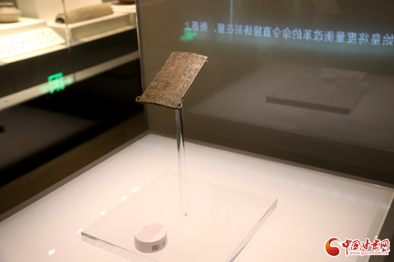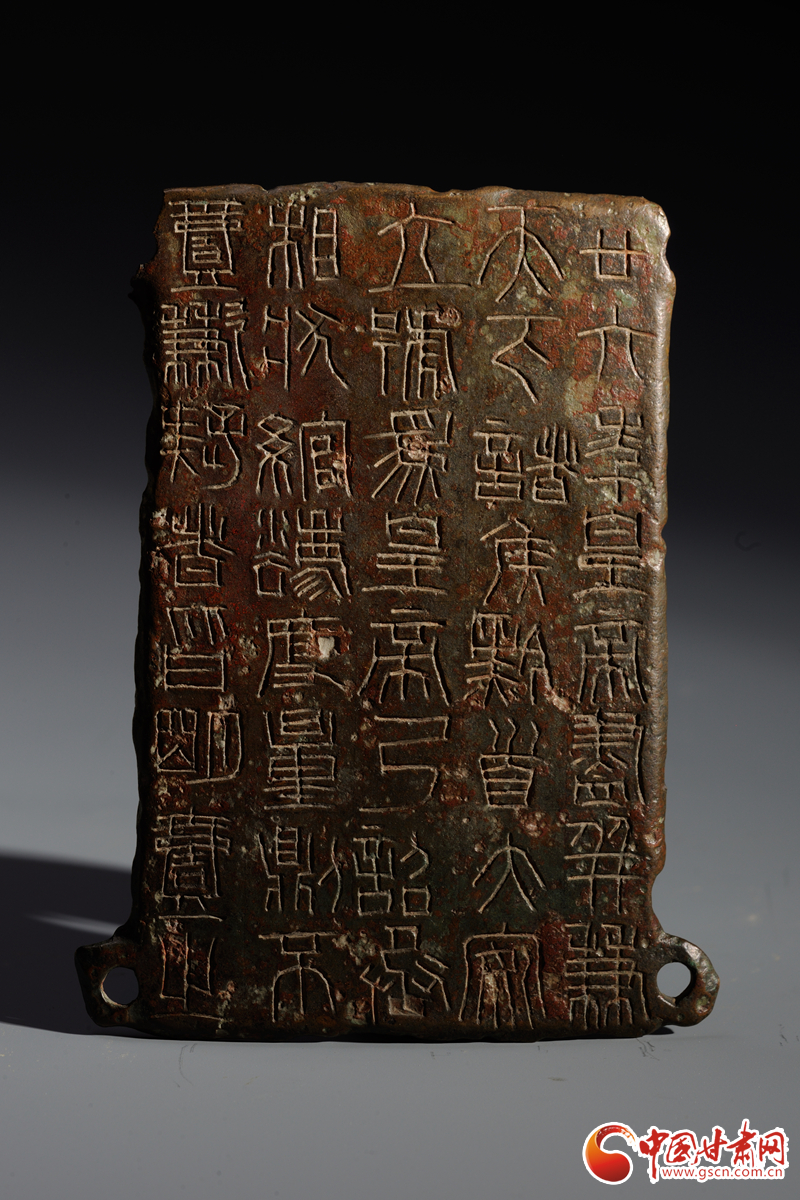 中國(guó)甘肅網(wǎng)9月14日訊(西北角·中國(guó)甘肅網(wǎng)記者 孫珩力)秦詔版,是指刻有秦始皇或秦二世統(tǒng)一度量衡詔書的銅版,有的鑲在鐵權(quán)、銅權(quán)上;有的四角有孔,用以釘在木頭的量器上。目前我國(guó)出土的刻有秦始皇詔文的遺物有銅橢量、銅錢等,不僅數(shù)量多而且分布也廣,而像這樣把詔文刻在銅版上的詔版形式在全國(guó)極為罕見,鎮(zhèn)原縣博物館收藏的就是其中之一,可謂稀世珍品。