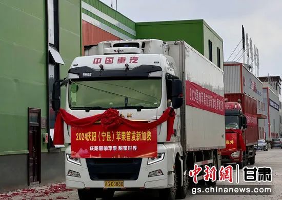 近日,甘肅慶陽(yáng)蘋(píng)果首次出口新加坡。圖為滿載25噸蘋(píng)果的貨車(chē)出發(fā)。