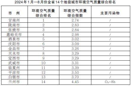 甘肅省生態(tài)環(huán)境廳發(fā)布2024年1月—8月份全省14個(gè)地級城市環(huán)境空氣質(zhì)量排名情況