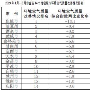 2024年1月—8月份,全省14個(gè)地級城市環(huán)境空氣質(zhì)量改善情況排名由好到差分別為:張掖市、臨夏州、酒泉市、武威市、嘉峪關(guān)市、甘南州、定西市、天水市、金昌市、平?jīng)鍪小足y市、蘭州市、隴南市、慶陽市。