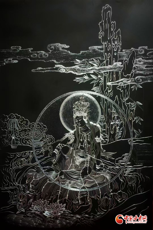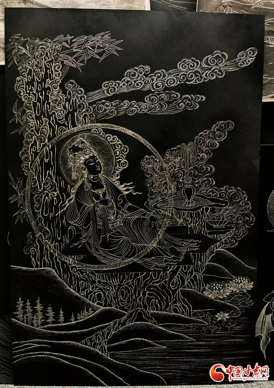 對(duì)張兆武來說,做鍥金畫從來不是“照貓畫虎”。他琢磨傳統(tǒng)書畫的筆墨、篆刻的力道,慢慢攢出了自己的一套刀法;創(chuàng)作時(shí),心里裝的也全是敦煌——從莫高窟第112窟里“反彈琵琶”的靈動(dòng)舞姿,到傳說中“九色神鹿”的溫潤模樣,都成了他刻刀下的主角。他刻出的飛天,飄帶像帶著風(fēng);刻出的菩薩,眉眼間透著莊重;金屬的光澤在畫面上流轉(zhuǎn),明明是靜態(tài)的畫,卻像在講一段活的敦煌故事。“不用多說什么,看過的人能懂這份美。”張兆武說的這份“懂”,恰恰打破了文化和語言的距離,讓東方的古老美學(xué),和全世界的現(xiàn)代審美碰出了共鳴。