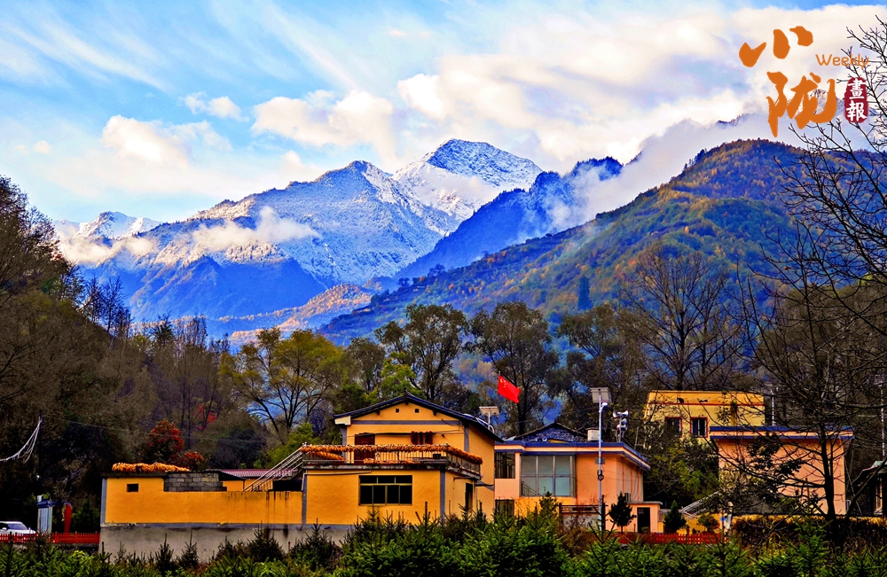 遠處的雪峰與近處的彩林、藏式民居融為一體,形成一幅和諧畫卷。在這里,每一步都是一幅畫,每一眼都是一首詩。