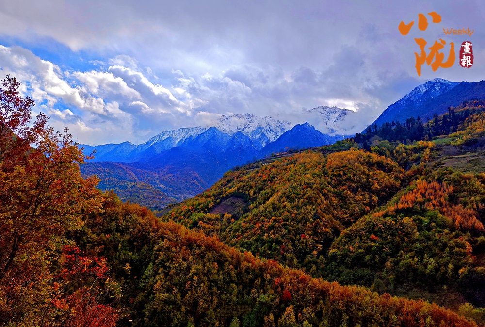 山巔的白雪與彩林形成鮮明對比,紅與黃,白與藍,在陽光的映照下,共同編織出一幅溫柔而夢幻的畫卷。