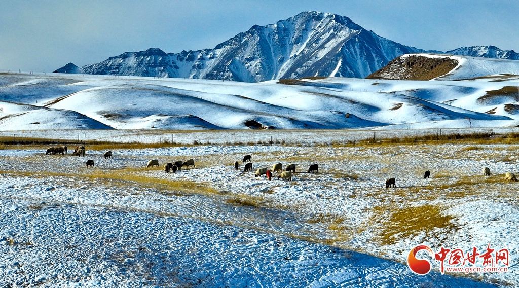 1月24日雪后初霽,肅南裕固族自治縣境內(nèi)的祁連山銀裝素裹,云霧繚繞。雪山、峽谷、森林、草原在皚皚白雪中交相輝映,冬意盎然。牛群、馬群與羊羔在雪中草原上靜靜的覓食,勾勒出一幅人與自然和諧共生的壯美畫卷。