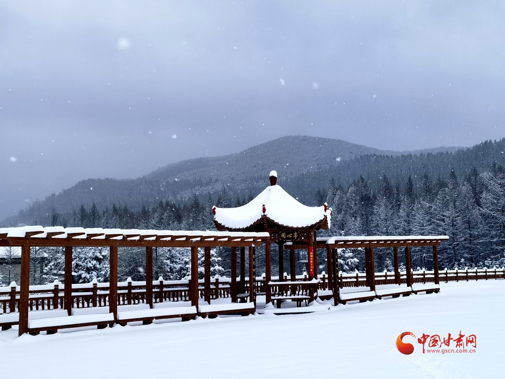 八路溝觀景廣場上,“同心亭” 靜立雪中。飛檐翹角覆滿素雪,更顯古樸雅致,旁側(cè)長廊銀裝環(huán)繞,宛若通往仙境的幽徑。憑欄遠(yuǎn)眺,群山莽莽,林海茫茫,盡覽大自然的鬼斧神工。