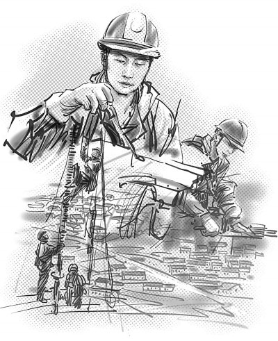 就個人條件而言,胡洪煒一米八的身高其實(shí)并不適合帶電作業(yè),但三年軍營練就的結(jié)實(shí)精壯以及先天的敏捷機(jī)靈完美地補(bǔ)充了身高的短板。多年之后,閆旭東依然清晰地記得徒弟曾經(jīng)帶給他的震撼。帶電作業(yè)兩大危險(xiǎn),一是高空,一是帶電。軟梯是電力人得以騫翮遠(yuǎn)翥的依傍,可攀爬軟梯卻一度打濕了胡洪煒振翅欲飛的翅膀。新員工入職培訓(xùn)的訓(xùn)練場上,別人用一個月已經(jīng)熟練掌握了技巧,笨鳥胡洪煒卻剛剛及格。氣喘吁吁地爬到基塔的頂端,將自己蟄伏在離地面幾十米高的電線上,想像自己是一只俯瞰大地的鳥雀,一只暫時休整的雨燕,抑或是被印刷在音樂課本上的音符。音符在胡洪煒耳邊輕聲吟唱:我要飛得更高,更高!