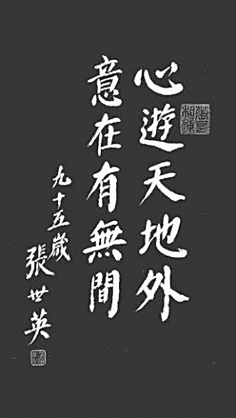 張先生的人生是圓滿(mǎn)的。趙樸初《遺囑》說(shuō):“生固欣然,死亦無(wú)憾。花落還開(kāi),水流不斷。我兮何有,誰(shuí)歟安息?明月清風(fēng),不勞尋覓。”弘一法師《辭世二偈》之二說(shuō):“華枝春滿(mǎn),天心月圓。”這些遺言,都顯示了一種人生圓滿(mǎn)的喜悅。張先生書(shū)法集中的兩句話(huà):“心游天地外,意在有無(wú)間。”同樣顯示了一種人生圓滿(mǎn)的喜悅。