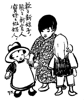 子愷先生藝術(shù)之獨特在另一方面——獨樹高標(biāo),表現(xiàn)童心童趣,抒情融入詼諧,展示了一種美學(xué)境界。此類經(jīng)典之作大多收集于《兒童相》。令人過目不忘者如畫孩子持兩蒲扇,一前一后,作騎馬狀,題曰“瞻瞻的腳踏車”;孩子將自己的鞋子墊于四腳圓凳之下,題曰“阿寶兩只腳,凳子四只腳”。于兒童經(jīng)驗之局限寫其心靈之天真,于不起眼的、平常人視之無所謂的現(xiàn)象中發(fā)現(xiàn)童心之美。還有一幅令人印象深刻,三個孩子,一女稍高,立于中,左側(cè)男孩,戴英式禮帽,甚大,右側(cè)女孩,頭蒙面布,題曰“軟軟新娘子,瞻瞻新官人,寶姊姊做媒人”。其事極不現(xiàn)實而孩子極慎重,于兒童顯示童心童趣,于畫則表現(xiàn)了先生的愛心和幽默。
