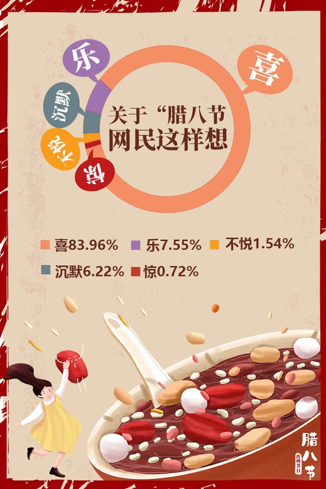 雖然今年多地的臘八節(jié)活動(dòng)因疫情而取消,但是人們對(duì)于團(tuán)圓、祥和、富裕、康寧、平安的期盼從未改變。有關(guān)“臘八”的網(wǎng)民情緒分布中,“喜”占83.96%,“樂”占7.55%??傮w來說,開心喜悅的情緒占到了九成以上。