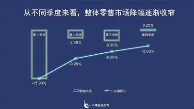 從時間軸來看,整體零售市場第一季度受疫情影響最為嚴重,同比下降15.93%,二季度復工復產復學急速收窄降幅,三季度同比下降3.3%,降幅略增,到第四季度回暖,同比出現小幅上漲,上升了0.25%。