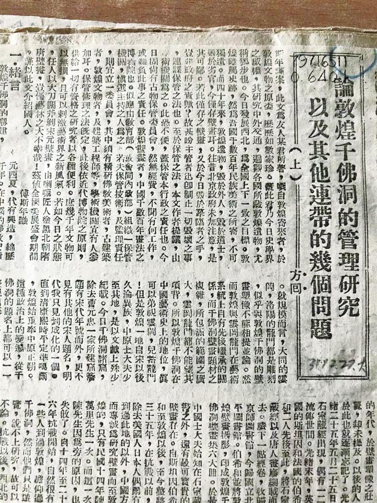 向達先生曾先后兩次考察敦煌,第一次是在1942年4月,中央研究院組織西北史地考察團,其中的歷史考古組由中央研究院歷史語言研究所、中央博物院與北京大學聯(lián)合組成,向達代表北大并擔任歷史考古組主任。在這次考察中,他在給友人、南京博物院院長曾昭燏的信件中講述了他第一次看到敦煌莫高窟時的激動心情,同時對于莫高窟受到自然和人為的毀壞而感到痛心。他用三天的時間寫成了一萬多字、此后對敦煌學有重大影響的《論敦煌千佛洞的管理研究以及其他連帶的幾個問題》,署名“方回”寄給了傅斯年,后經(jīng)傅斯年推薦,在重慶的《大公報》連載發(fā)表,文中提出將千佛洞收歸國有,由學術(shù)機構(gòu)進行管理,開展研究工作等建議。此文發(fā)表,一石激起千層浪,直接推動國立敦煌藝術(shù)研究所于1944年成立。研究所成立后,常書鴻任所長。這也開啟了“敦煌學”長流不息的淵源。樊錦詩后來也撰文稱:“他(向達)文章中提出的關(guān)于保護和管理的具體建議,被后來成立的敦煌藝術(shù)研究所采納,成為敦煌石窟保護和管理的參照。向達提出的‘不可輕易剝離壁畫’的主張,也是敦煌研究院幾十年來在壁畫保護和管理中一直恪守的紀律和原則。”