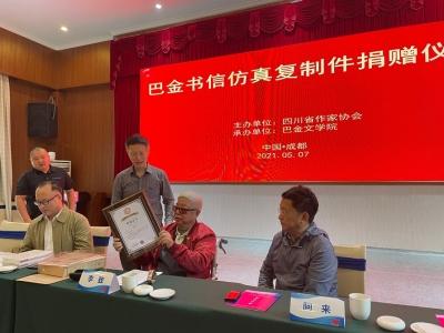 捐贈儀式由四川省作協(xié)黨組書記侯志明主持,省作協(xié)主席阿來致辭。省作家協(xié)會向李致頒發(fā)了收藏證書。詩人黎陽現(xiàn)場朗誦了巴金大哥寫給巴金一封信的選段,內(nèi)容充滿情感,令人動容。朱丹楓、廖全京等文藝界人士,以及巴金多位親屬出席了捐贈儀式。