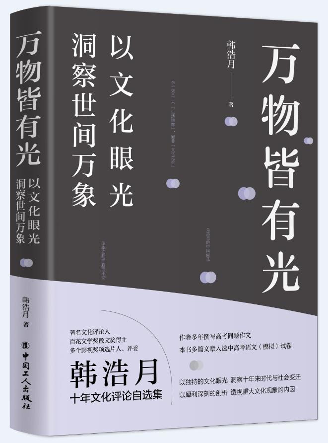近日,文化評論人韓浩月新作《萬物皆有光》由中國工人出版社出版。韓浩月深耕于文化領(lǐng)域評論,對文化熱點、現(xiàn)象與人物的評論有自己獨到的視角與見解。本書是其近十年來發(fā)表于各大媒體的評論精選集。