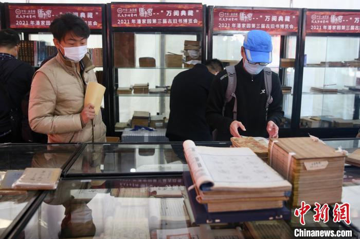 20日,“萬(wàn)閱典藏”第三屆古舊書(shū)博覽會(huì)在北京潘家園舊貨市場(chǎng)開(kāi)幕,圖為博覽會(huì)現(xiàn)場(chǎng)?!≈行律?nbsp;易海菲 攝
