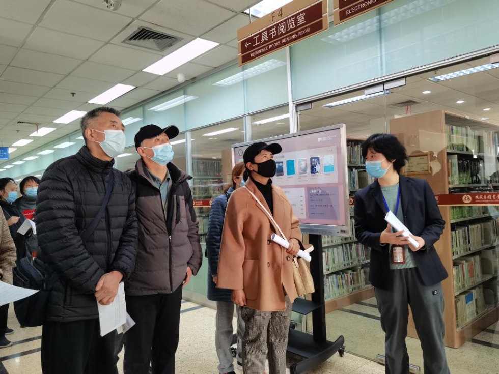 圖書館里的志愿者老師帶領(lǐng)老人游覽圖書館,并用英語進(jìn)行講解。新華社記者汪海月攝