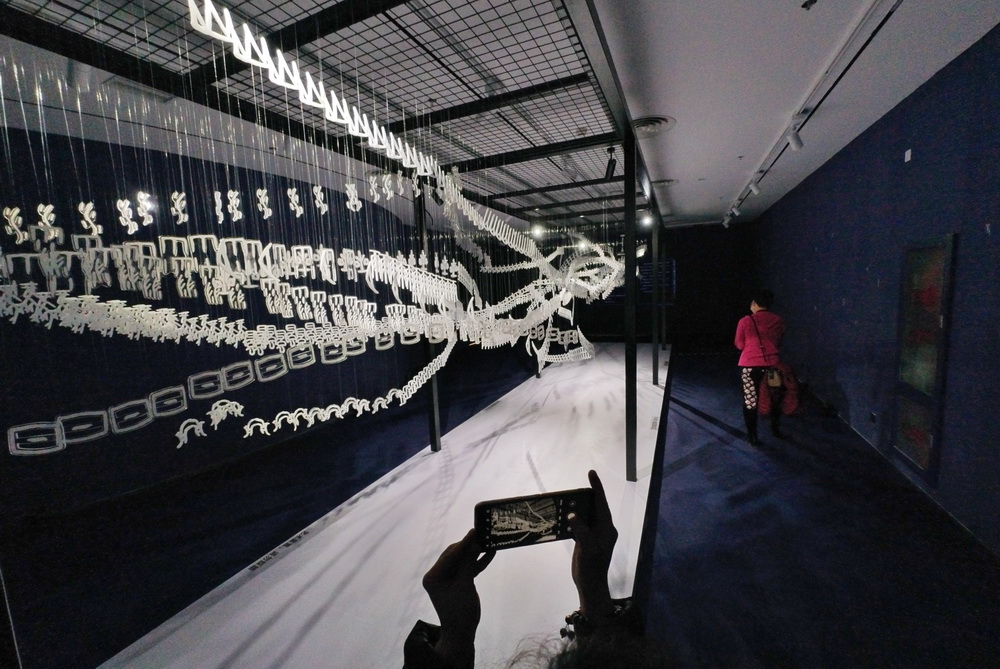 2022年1月3日,天津國圖·津?yàn)澄膭?chuàng)空間舉辦,甲骨文創(chuàng)意展,一名參觀者用手機(jī)拍攝甲骨文懸空雕塑。 中新社記者 佟郁 攝