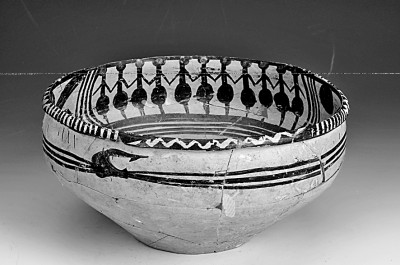 舞蹈紋彩陶盆,馬家窯文化,1995年7月青海省同德縣宗日遺址157號墓出土。圖片選自《國寶中的黃河文明》