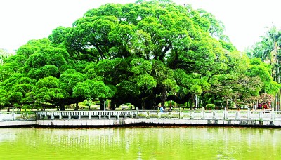 擁有古樹的城市就是擁有歷史的城市。福州古榕遍布,四季常青,是城市、市民生活與樹木的完美結(jié)合,是風(fēng)景的自然生長(zhǎng),是歷史根深葉茂地屹立。福州古榕以樹齡長(zhǎng)、歷史久、數(shù)量眾而著稱。見證福州城市史的,當(dāng)首推鼓山國(guó)家森林公園、八一水庫(kù)旁,福州無(wú)人不知的已近千歲,被譽(yù)為福州榕樹王的古榕。相傳,這棵古榕是張伯玉所栽植的兩棵樹苖,光陰荏苒,同氣相求,如今兩棵榕樹相互糾結(jié)、勾連、纏繞、親密,已無(wú)分彼此。其冠幅達(dá)1300米,可容納千人在樹下談古論今,聊天遮陰。遠(yuǎn)望,似綠色陵巖;近看,知其為榕也,密密的枝葉把近午的陽(yáng)光切割成碎花點(diǎn),散落、閃亮在榕樹下的草坪和地衣上。初訪者或?yàn)橛牣悾嘿即笠豢霉砰艆s不見氣根,知榕者會(huì)告訴你,這是一株碩大、古老而不生氣根的細(xì)葉榕。因其冠幅日益長(zhǎng)大,為了支撐沉重的樹冠、預(yù)防主干折損,便制作了若干石柱,砥柱其間。古榕下有湖塘,錦鯉游泳,不時(shí)生出紅色漣漪。旁有一碑,上刻:榕蔭照水波心漾,觀魚猶勝花間行。