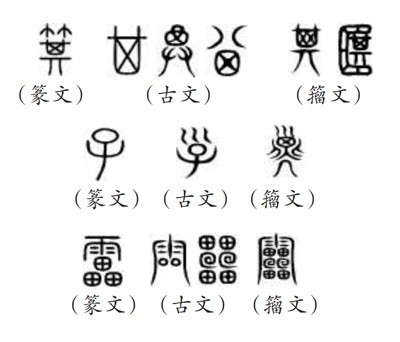 (五)所謂“9353”,指的是《說文》所收全部正篆,即《說文》分析解釋的全部字?!墩f文》收字以篆文為“正”,作為標準字體,這就是許慎所說的“今敘篆文,合以古籀”的收字原則。“今敘篆文”,就是以篆文(小篆)作為標準正字,同時也會根據(jù)需要收列部分古文和籀文?!墩f文》所謂“古文”主要是孔子壁中書和民間所獻古文經(jīng)所用的文字,“籀文”即傳為西周晚期太史籀所編字書《史籀篇》上的文字。從《說文》來看,收入的古文、籀文,主要是與篆文有明顯差異的字形。如篆文“箕”“子”“雷”下所收列的古文、籀文: