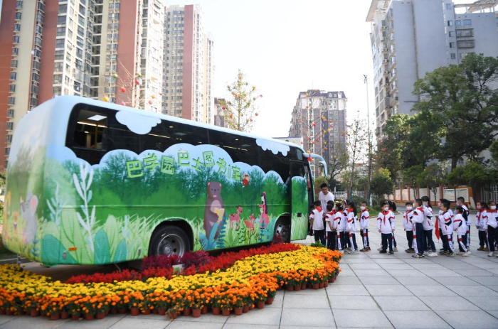 11月10日,長沙市青園友誼小學(xué)的學(xué)生排隊進入巴士圖書館。