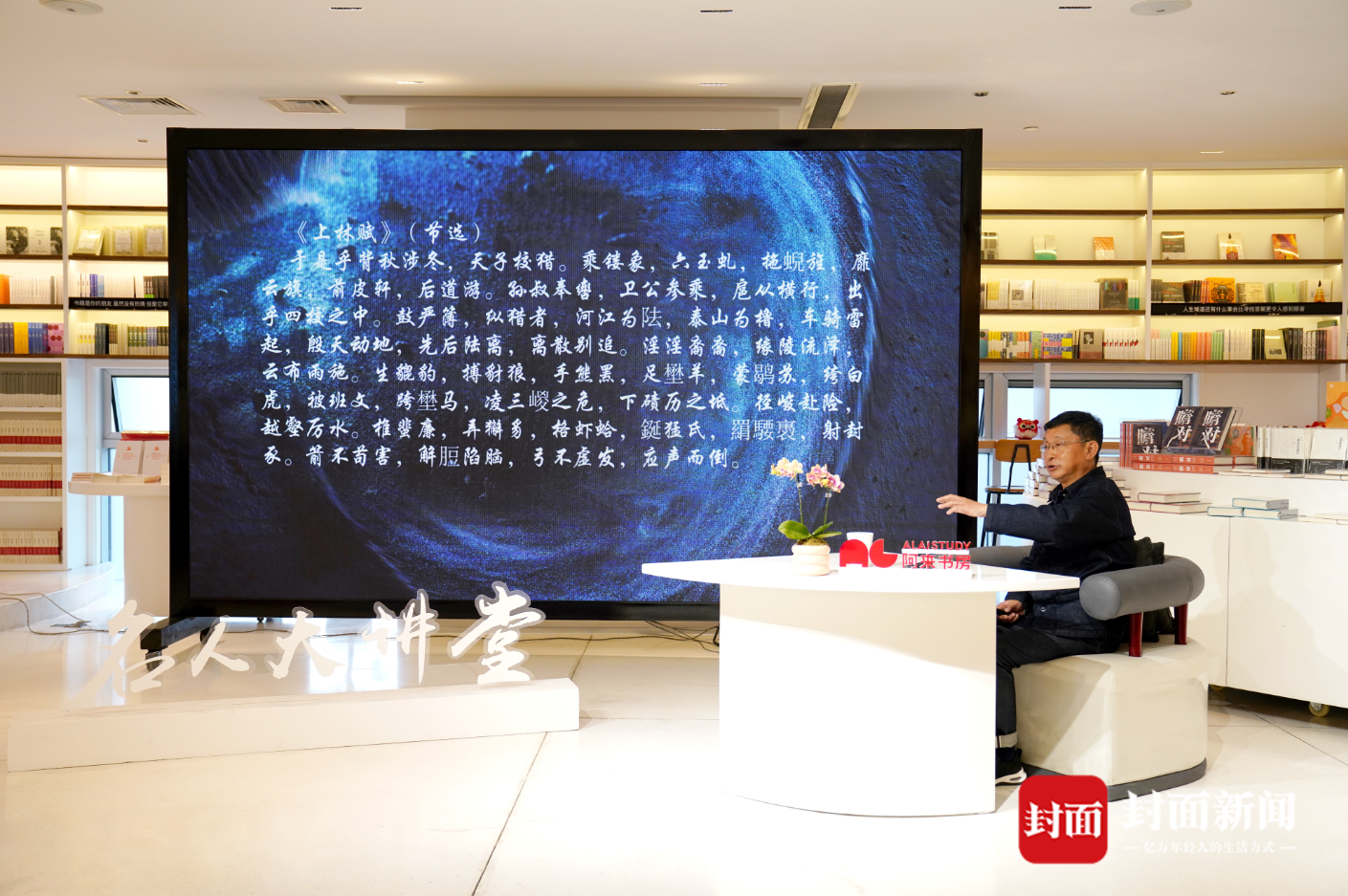 作為資深作家,阿來(lái)在講述司馬相如其人以及他所處的時(shí)代特點(diǎn)、文史知識(shí)同時(shí),還重點(diǎn)從文學(xué)的角度,講解了相關(guān)文史記載文章,還特別以《子虛賦》《上林賦》等司馬相如的作品為例,逐字逐句進(jìn)行分析“賦”這個(gè)文體的優(yōu)、缺點(diǎn)。比如在《上林賦》中,司馬相如寫(xiě)楚國(guó)之子虛先生出使齊國(guó),子虛向?yàn)跤邢壬v述隨齊王出獵,齊王問(wèn)及楚國(guó),子虛極力鋪排楚國(guó)之廣大豐饒,以至云夢(mèng)不過(guò)是其后花園之小小一角。烏有不服,便以齊國(guó)之大海名山、異方殊類(lèi),傲視子虛。