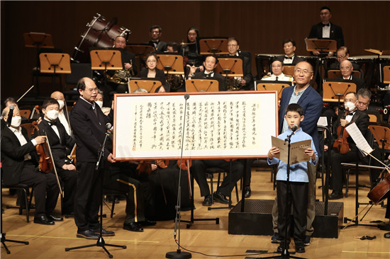 2月23日,北京,“前哲垂范 文津日新”——梁啟超誕辰150周年紀(jì)念配樂朗誦音樂沙龍在國家圖書館舉行。中國國家圖書館館長熊遠(yuǎn)明(左)向梁啟超后人贈手書《少年中國說》。 蔣啟明/攝