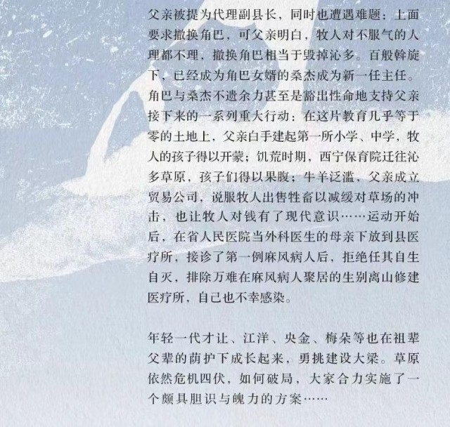 《雪山大地》將青藏高原幾十年來發(fā)生的改天換地,以及以“父親母親”為代表的三代建設(shè)者在這片土地上耕耘建設(shè)的日日夜夜,展現(xiàn)在讀者面前。人與自然、人與動物、生態(tài)與發(fā)展的主題貫穿始終,全景式地展現(xiàn)了藏族牧民傳統(tǒng)社會形態(tài)和生活樣貌的變遷。