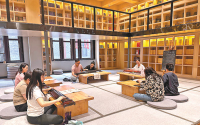 圖為讀者在沈陽(yáng)老北市漢字主題書(shū)房學(xué)習(xí)彈奏古琴。記者 胡婧怡攝