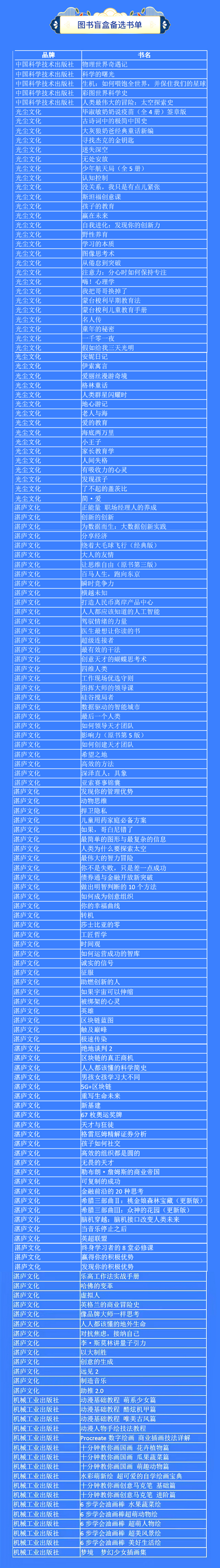 本次活動(dòng)由新華云商聯(lián)合機(jī)械工業(yè)出版社、中國(guó)科學(xué)技術(shù)出版社、光塵文化、湛廬文化共同推出。盲盒內(nèi)圖書涵蓋經(jīng)管技術(shù)類、歷史人文類、心理健康類等品類,將隨機(jī)搭配三本,可能與您的藏書重復(fù),或不符合您的閱讀愛好,請(qǐng)您慎重選擇理性購(gòu)買。同時(shí),盲盒內(nèi)會(huì)附贈(zèng)新華網(wǎng)文創(chuàng)徽章或書簽。