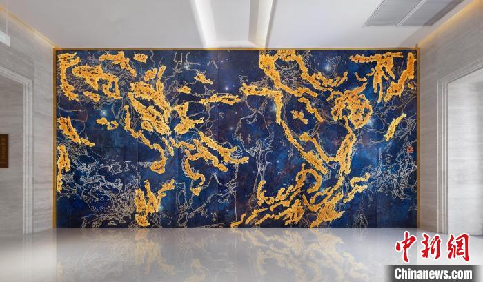 記者了解到,這幅熔銅壁畫采用國家級非遺銅雕技藝,結合熔銅藝術、釉彩著色等創(chuàng)新技藝制作而成,從設計、制作、誕生,全程歷時一年,難度很大。壁畫以朱炳仁手繪的星空“云水墨”制作,用大面積深藍宇宙為底,采用熔銅藝術構成繁星點點。
