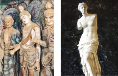 可是,“脅侍菩薩微笑著,在她低垂的眼中可能根本沒有勝負(fù)這回事。這種眼神是利他而非個人的……當(dāng)我們在45窟佛龕前微微俯下身子之時,溫暖的奇跡出現(xiàn)了,她正慈祥地看著你。一位是由堅硬的大理石所雕,另一位是由敦煌本地黏土所塑,維納斯和脅侍菩薩似乎代表了兩種生活態(tài)度。假如她們在盧浮宮中相遇,談?wù)撈鹈?。維納斯可能會唱起女詩人薩福的詩歌:‘你愛的就是美的。這容易解釋。’脅侍菩薩則依然保持微笑,靜靜地看著維納斯”。