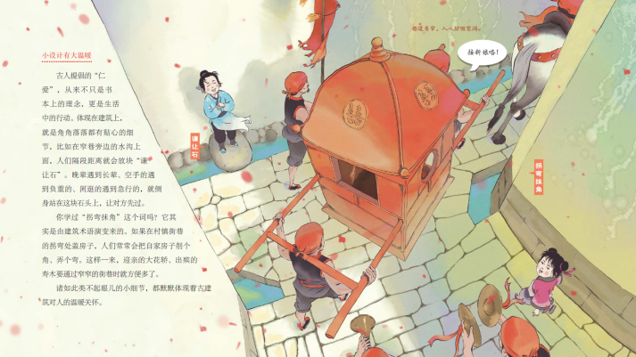 書(shū)中提到了在墻面削個(gè)角、弄個(gè)彎,“拐彎抹角”、方便大家行走的謙讓智慧;齊心協(xié)力,共同出資出力蓋房子的和諧智慧;技術(shù)和藝術(shù)并存,用榫卯聯(lián)結(jié)構(gòu)件的建構(gòu)智慧;防患于未然,保證人們生命、生活安全的防患智慧……
