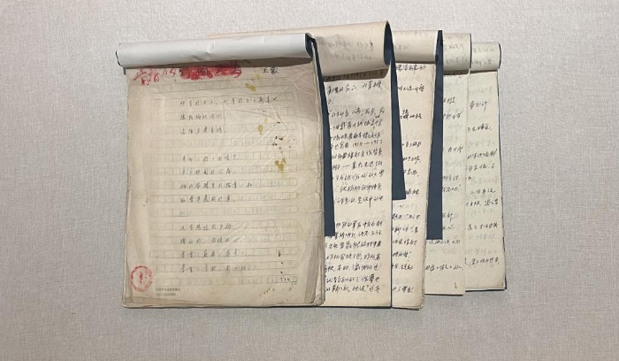 在展覽“青春萬歲”單元,一件珍貴的展品吸引眾人目光——5卷泛黃的稿紙上,寫著一行行藍色鋼筆字,這正是王蒙創(chuàng)作《青春萬歲》的初稿。