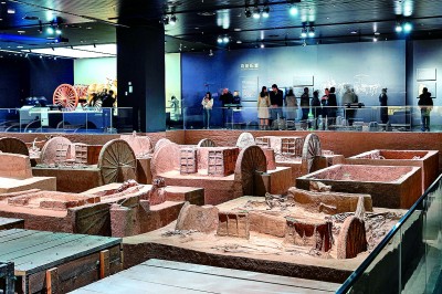 在二樓展廳展出的名為“陶”的文物,形狀呈圓餅狀,表面微微凸起,密密麻麻,這是商朝人洗澡時(shí)的清潔用具。殷墟考古發(fā)掘工作中,發(fā)現(xiàn)一種車(chē),車(chē)前俯身埋著兩個(gè)人,這很可能是一種人力車(chē),文獻(xiàn)稱(chēng)為“輦車(chē)”。在“車(chē)轔轔,馬蕭蕭”展廳,社科院考古所現(xiàn)場(chǎng)考古,把發(fā)掘過(guò)程展示給游客。