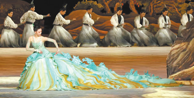 二〇二三年杭州亞運(yùn)會(huì)開幕式“國風(fēng)雅韻”篇服裝設(shè)計(jì)“水天碧”長裙,總設(shè)計(jì)師楚艷。