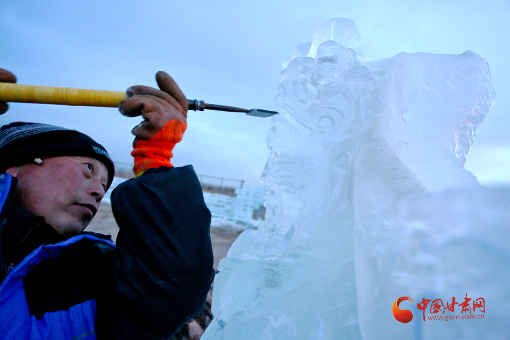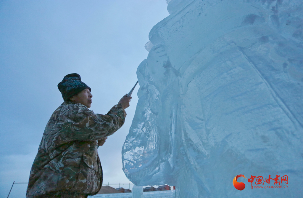 1月11日傍晚,張掖市甘州區(qū)屋蘭古鎮(zhèn)九曲黃河燈陣景區(qū)冰雕工藝師們正在加班加點趕制大型冰雕。