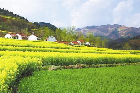 山巒蠢蠢欲動起來,卻比不過一些趕著腳步的植物,或許,它們還要頹敗一些時日。山腳處的田間,一片片油菜花泛動金色的光芒,為山巒繡上彩色的裙邊,散落在田壟之中的農舍瓦屋靜默在時光里,安逸、祥和,讓人向往。
