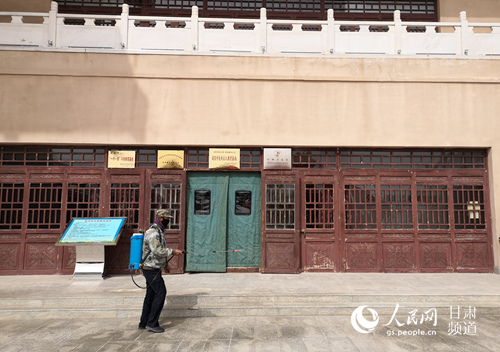 3月21日起,瓜州縣世界文化遺產(chǎn)鎖陽城遺址景區(qū)和草圣故里文化產(chǎn)業(yè)園恢復開放。圖為張芝紀念館工作人員正在進行消殺工作。(李雪 攝)