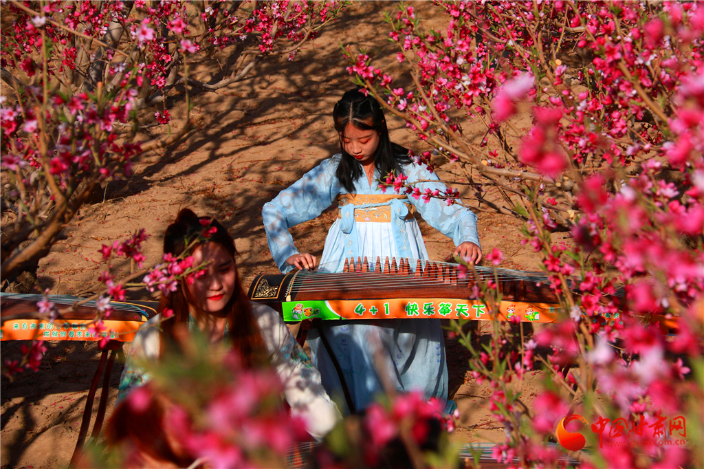 2020年4月22日,古箏愛(ài)好者在甘肅省敦煌市七里鎮(zhèn)杜家墩村的桃園中彈奏古箏。