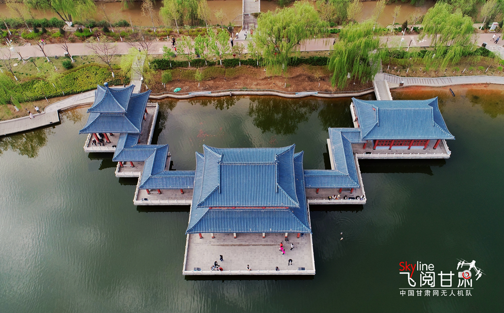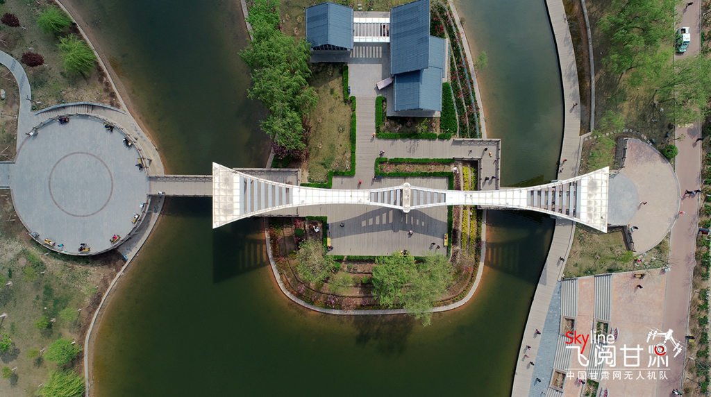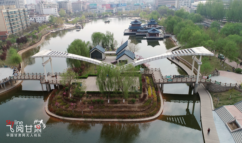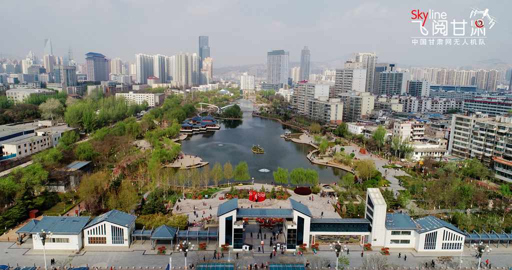 這是4月14日在蘭州市雁灘公園航拍的圖片,一湖碧水,滿園春色。